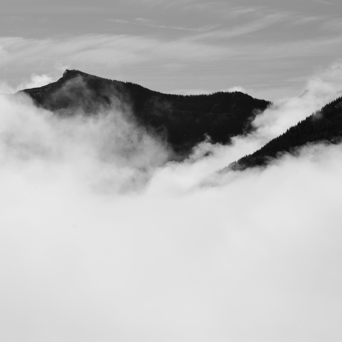 North Vancouver's local mountains almost covered in the morning fog.