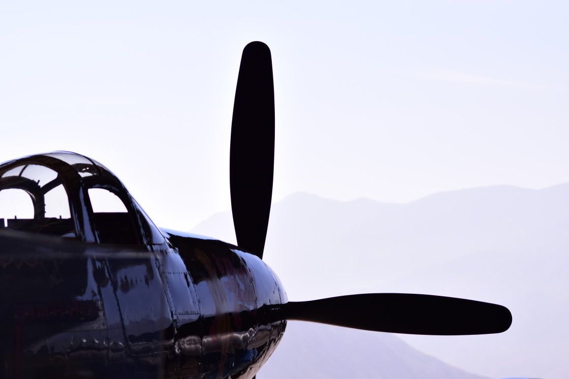A propeller airplane on display at the Palm Springs Air Museum at the Palm Springs CA airport.