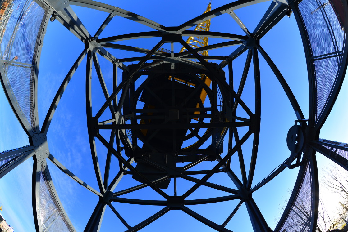 Another crane, seen from underneath with a fisheye lens, at a construction site. Vancouver, BC