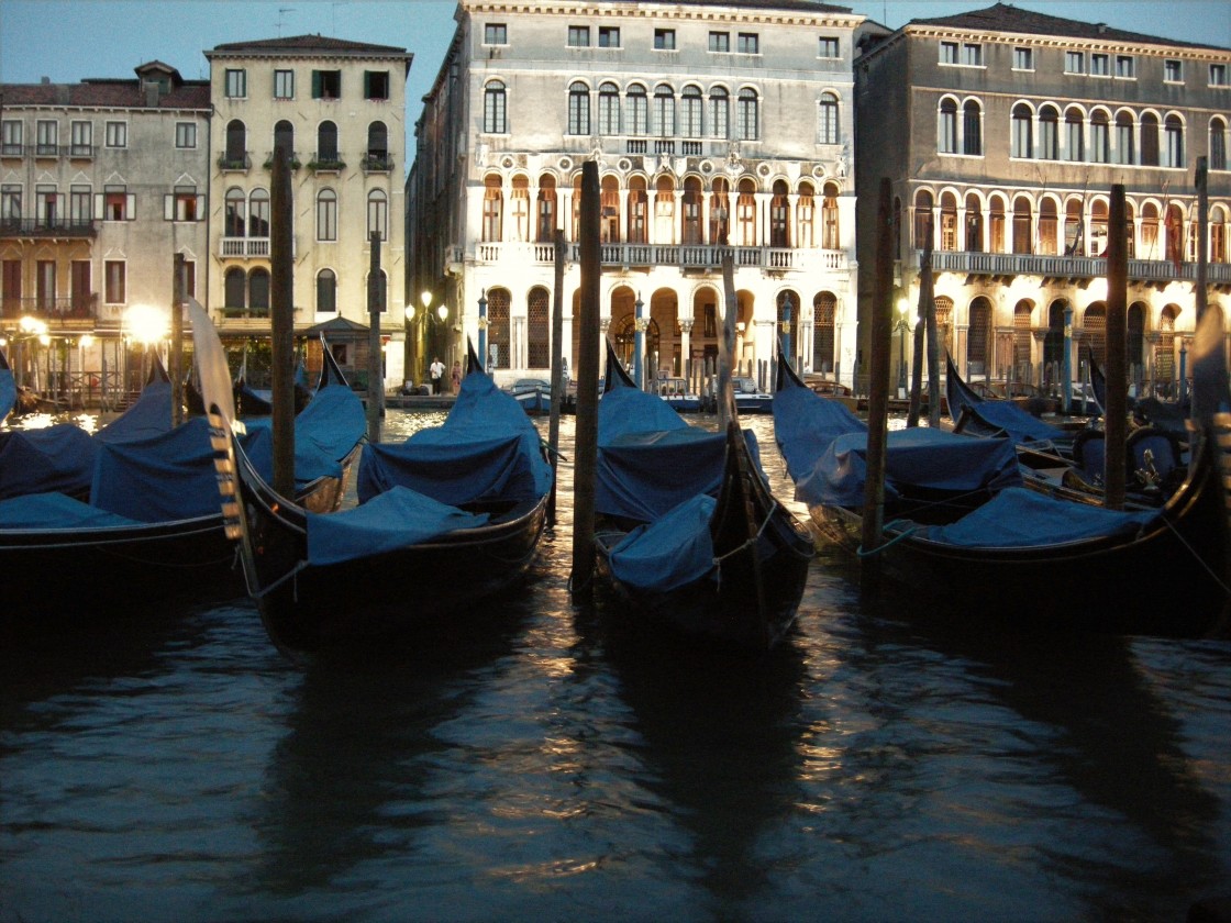 Gondola's are parked for the evening at the Grand Canal, Venice, Italy